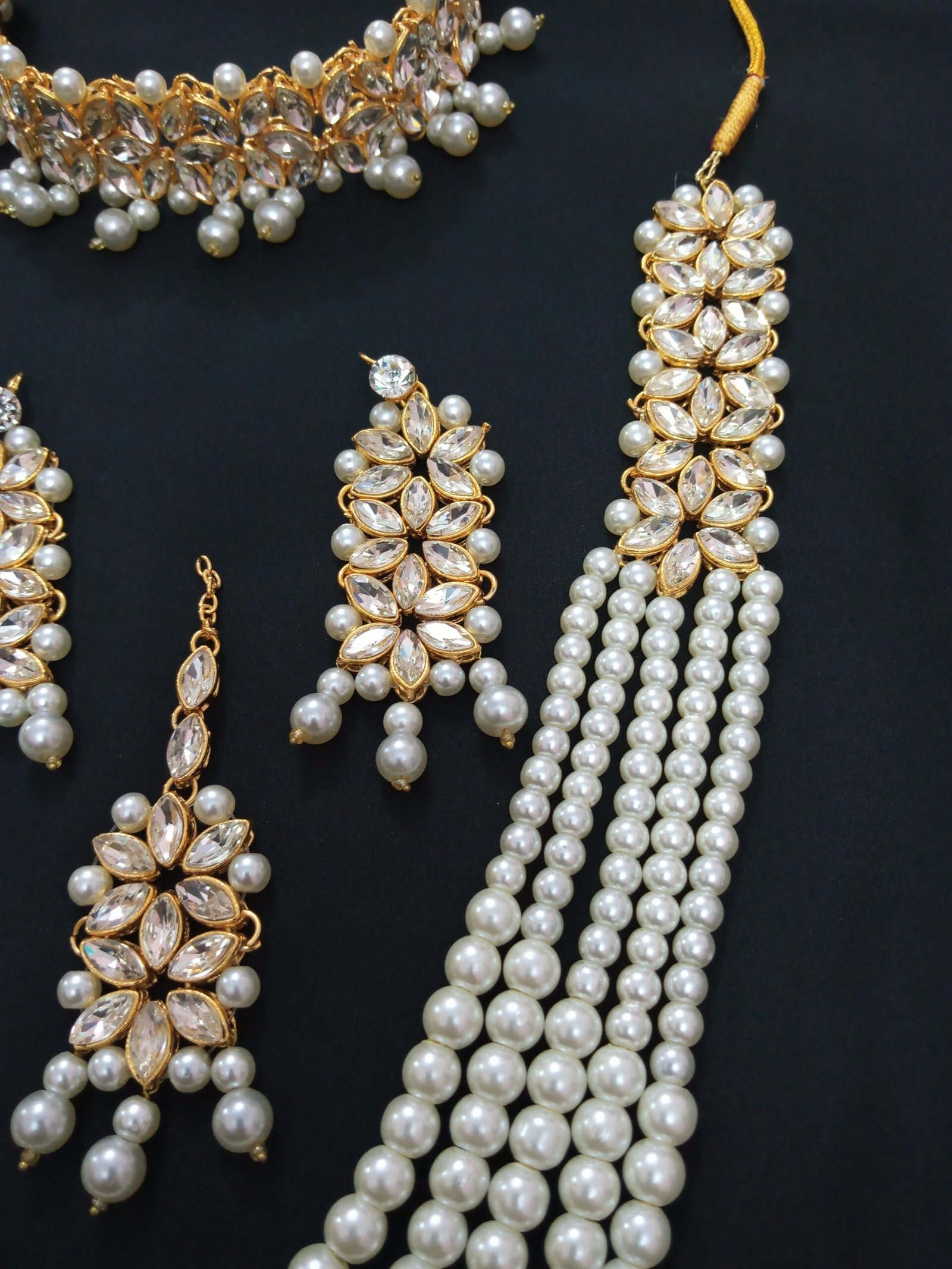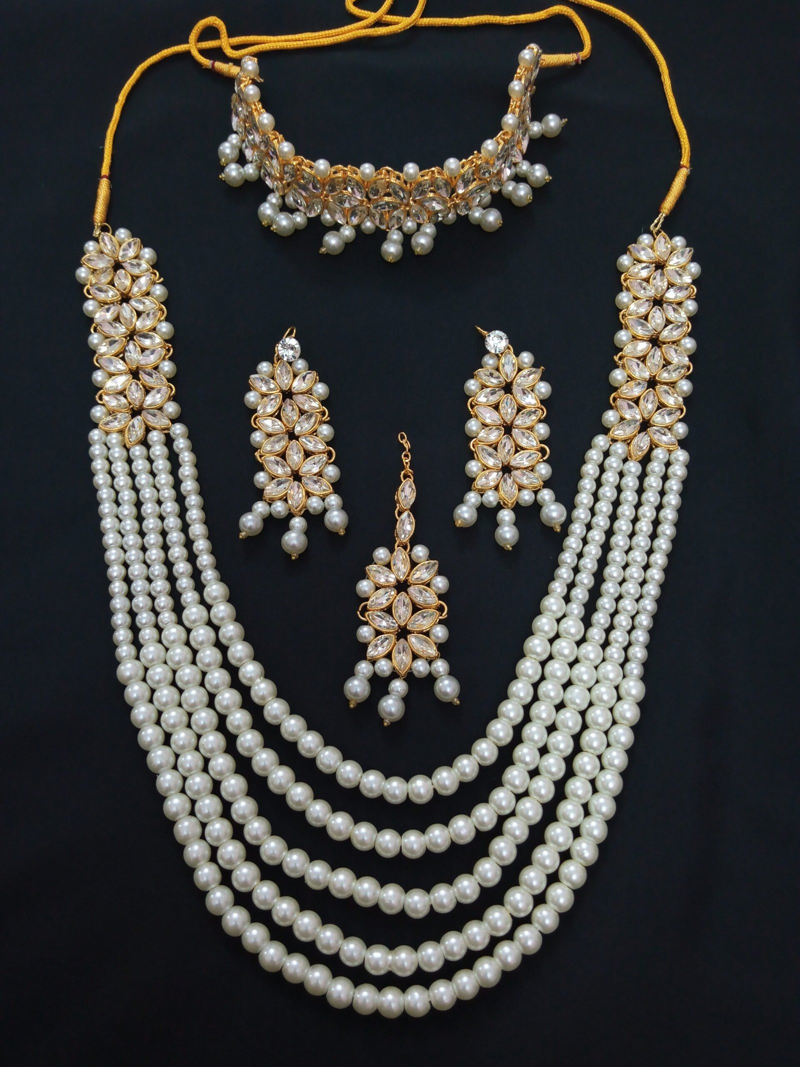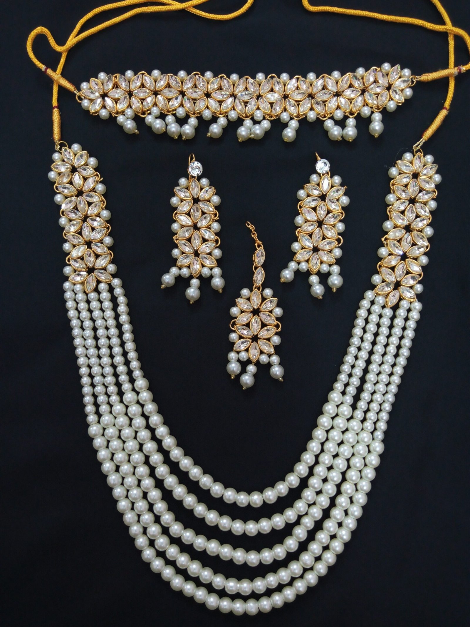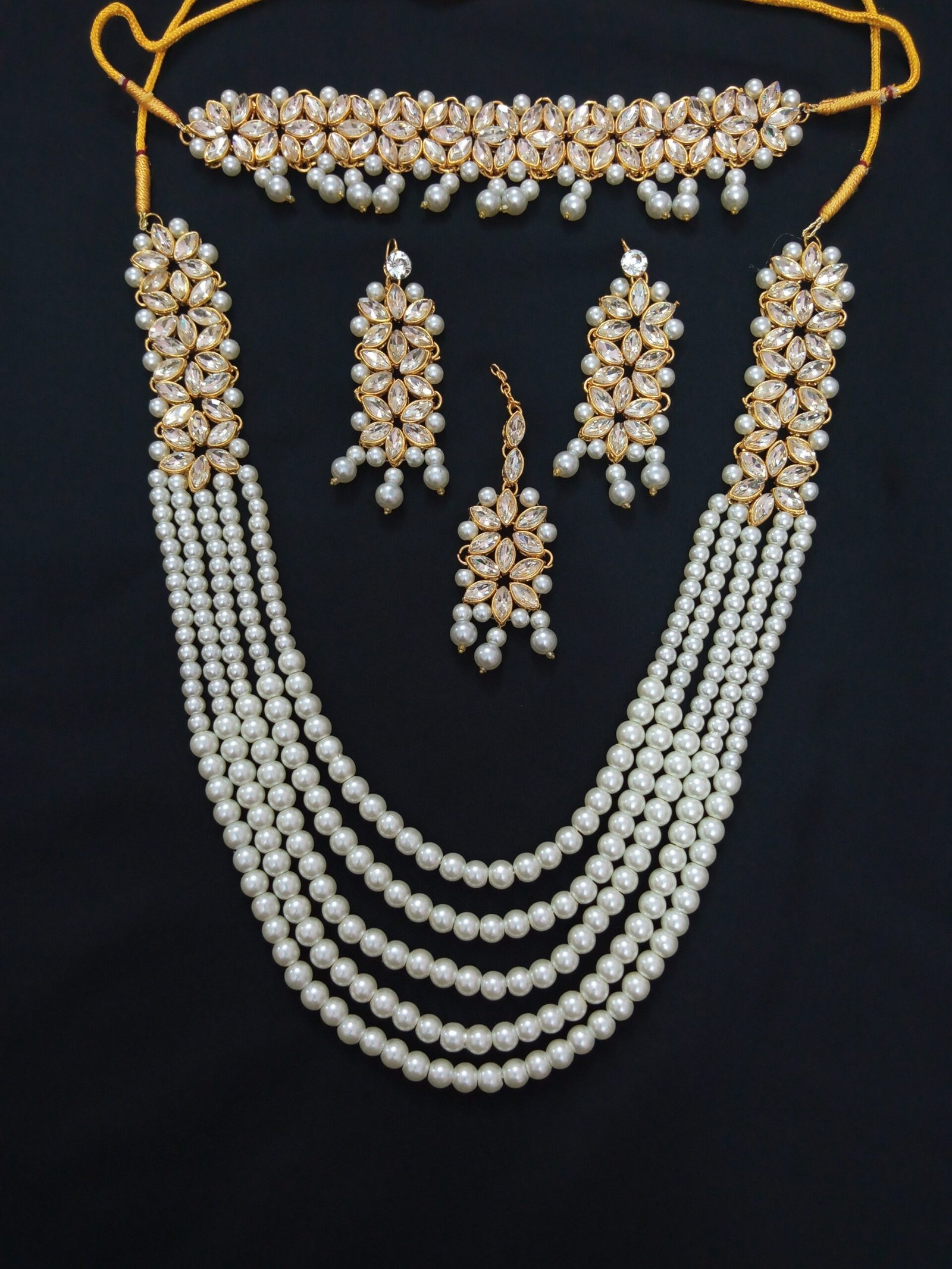 –Chokker adorned with floral stone patterns and pearl drops, tied with golden strings.