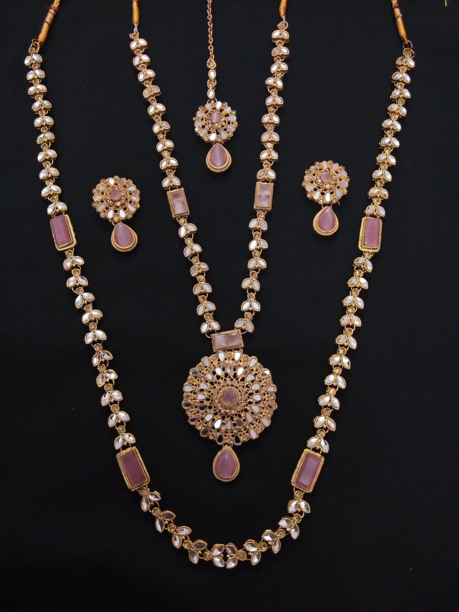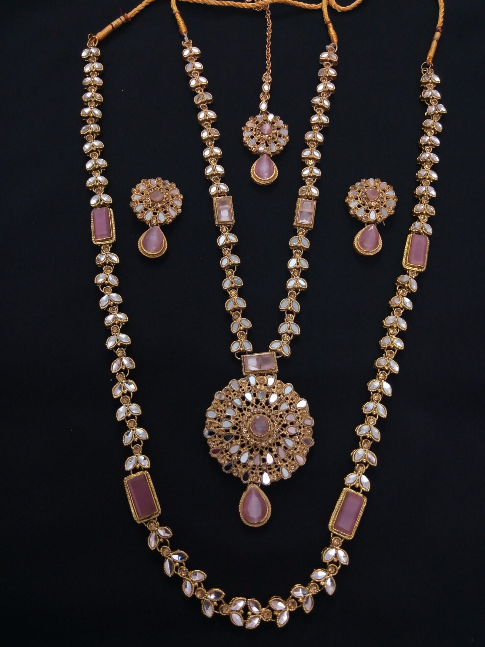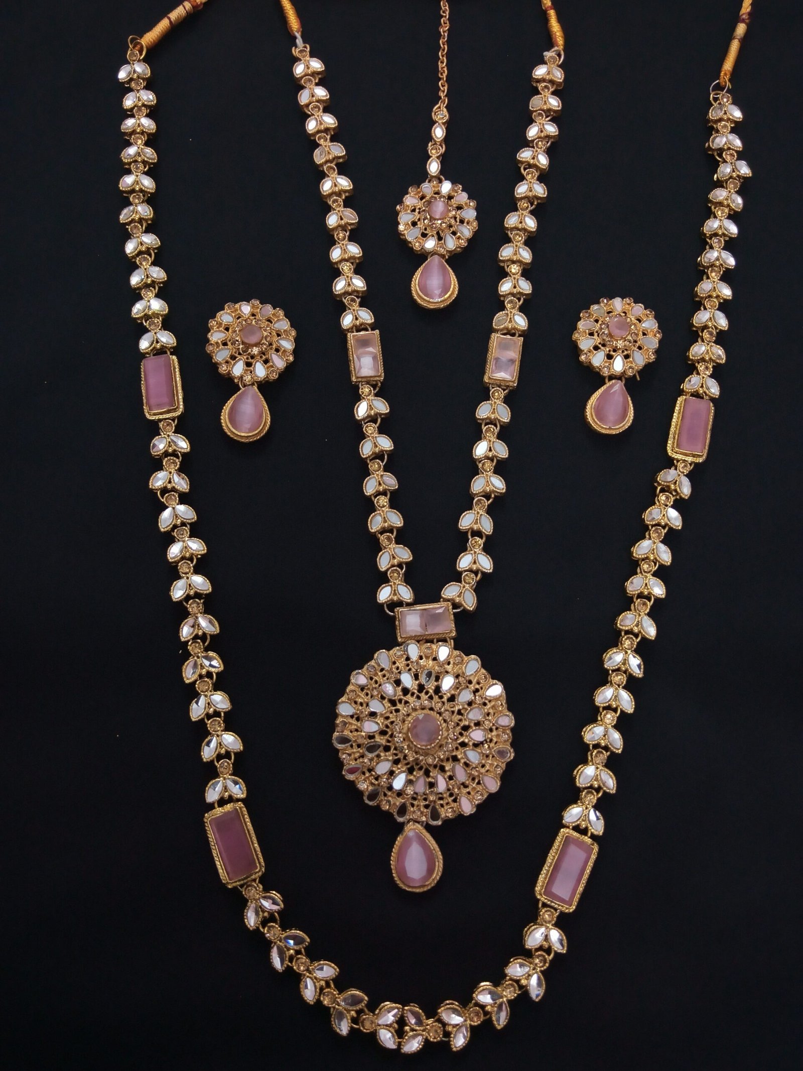 Bridal Set that includes a long Mala, Pendant Long Mala, a pair of matching earrings, and a maang tikka (forehead ornament).