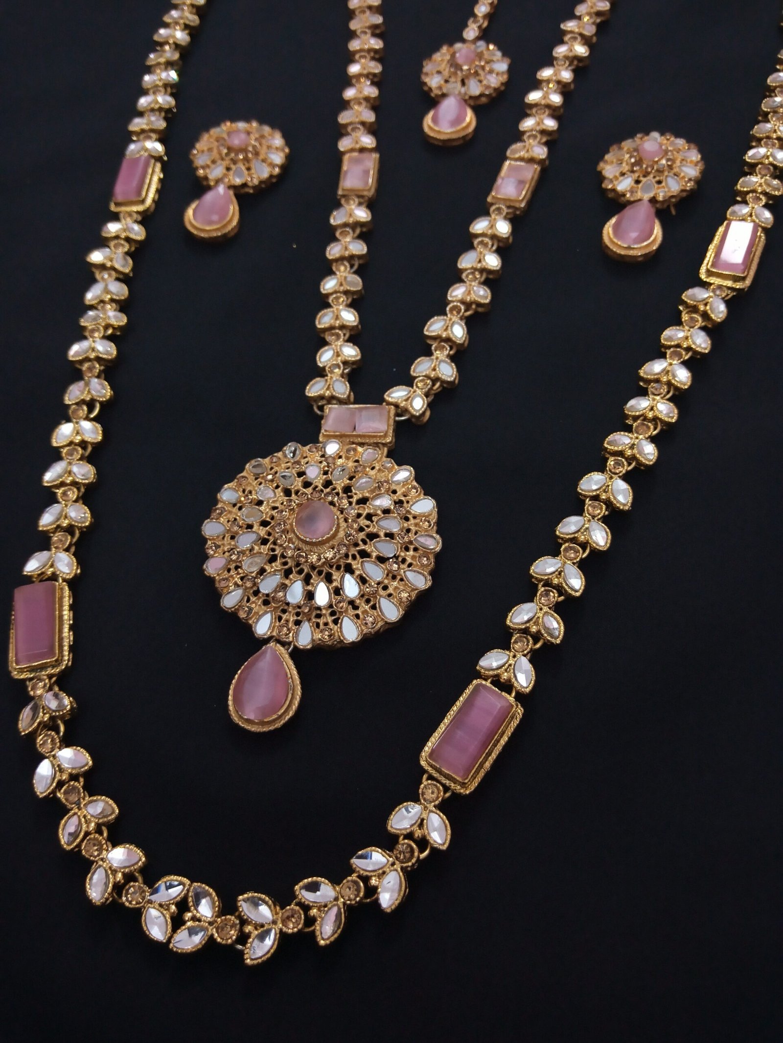 –Long Mala (Haar) features a gold-toned chain gracefully adorned with luminous mirror stones and intricate gold detailing. The four rectangular pink gemstones, set in ornate gold frames, lend a captivating contrast and regal elegance to the piece.