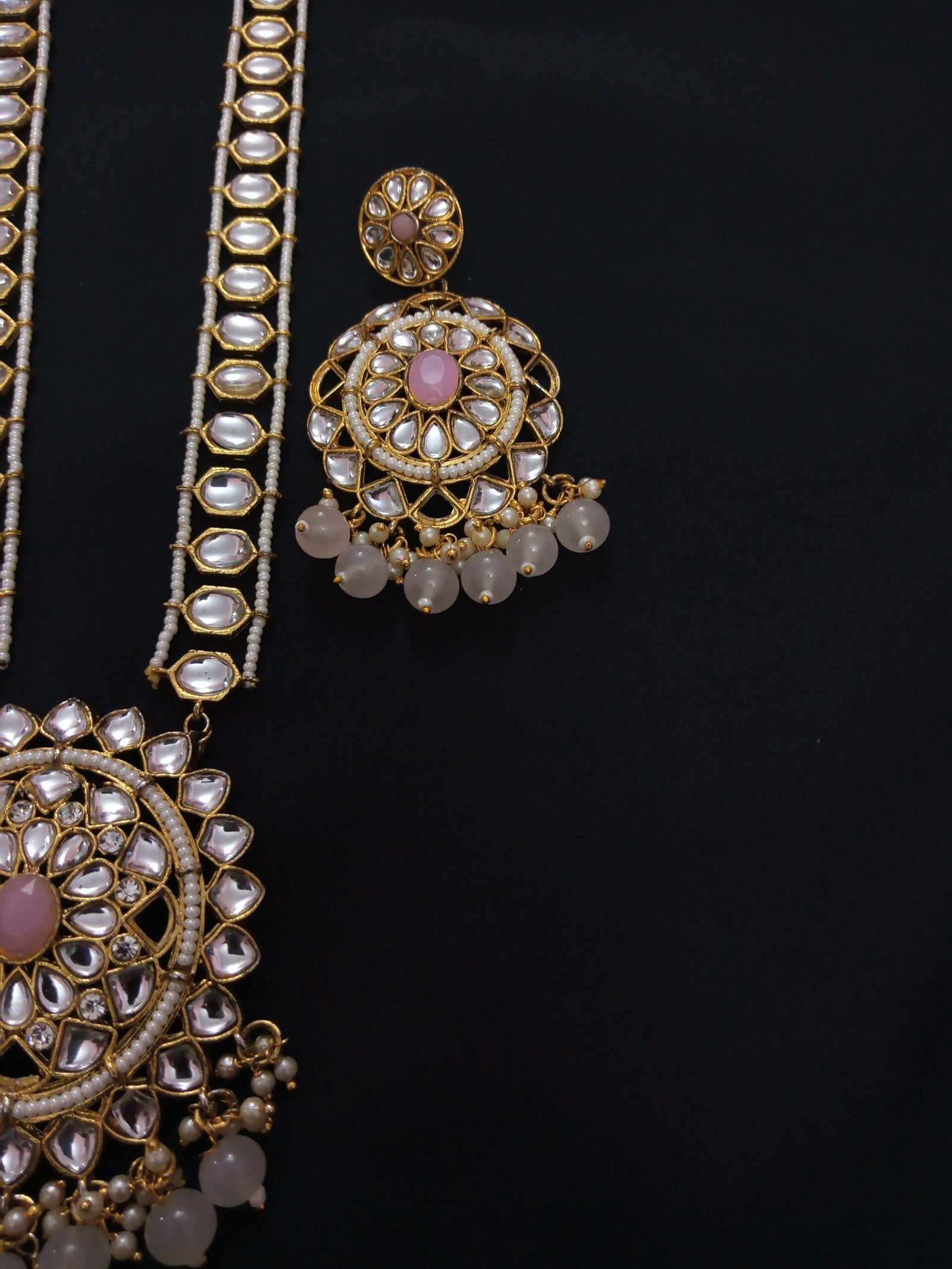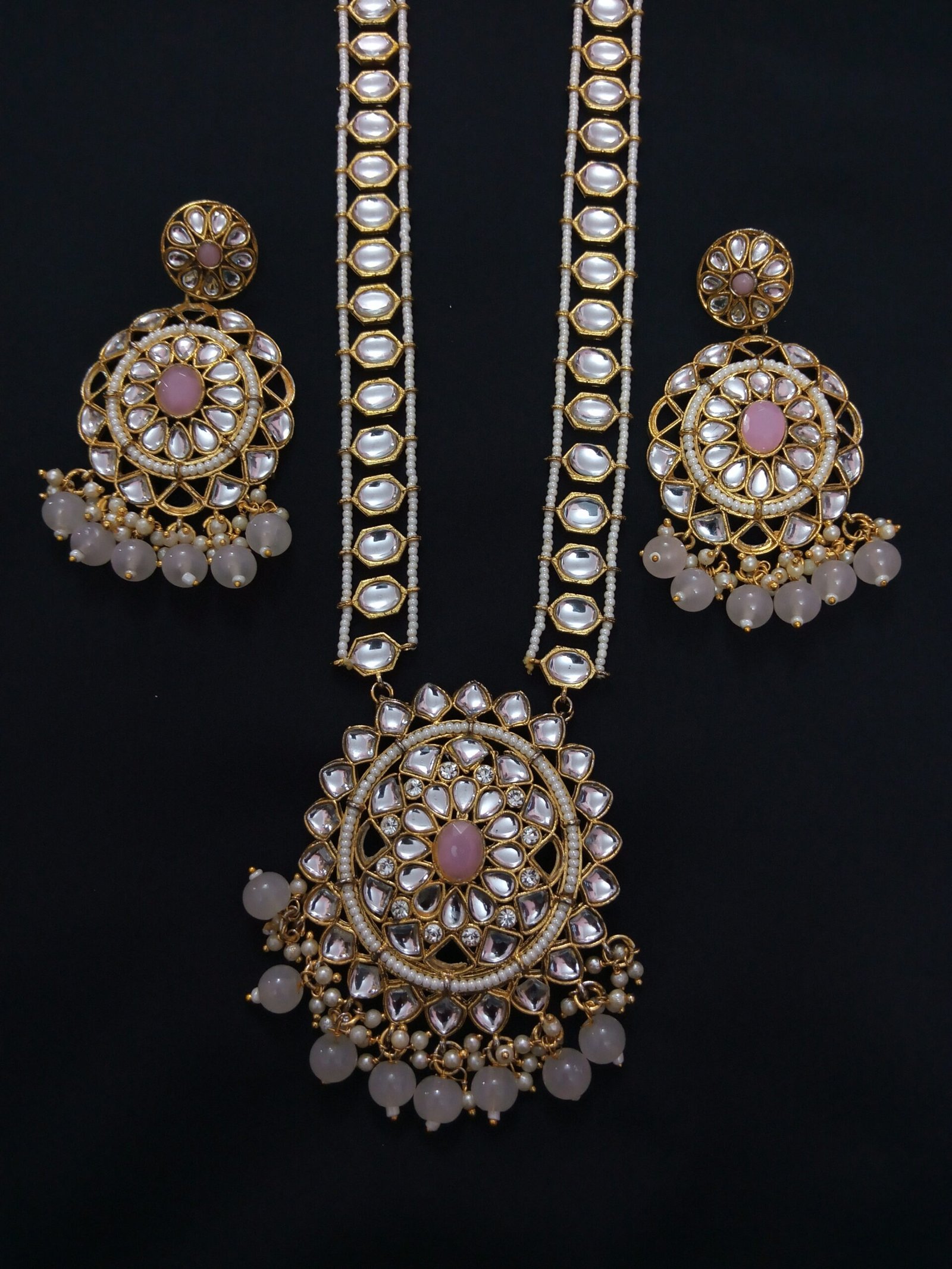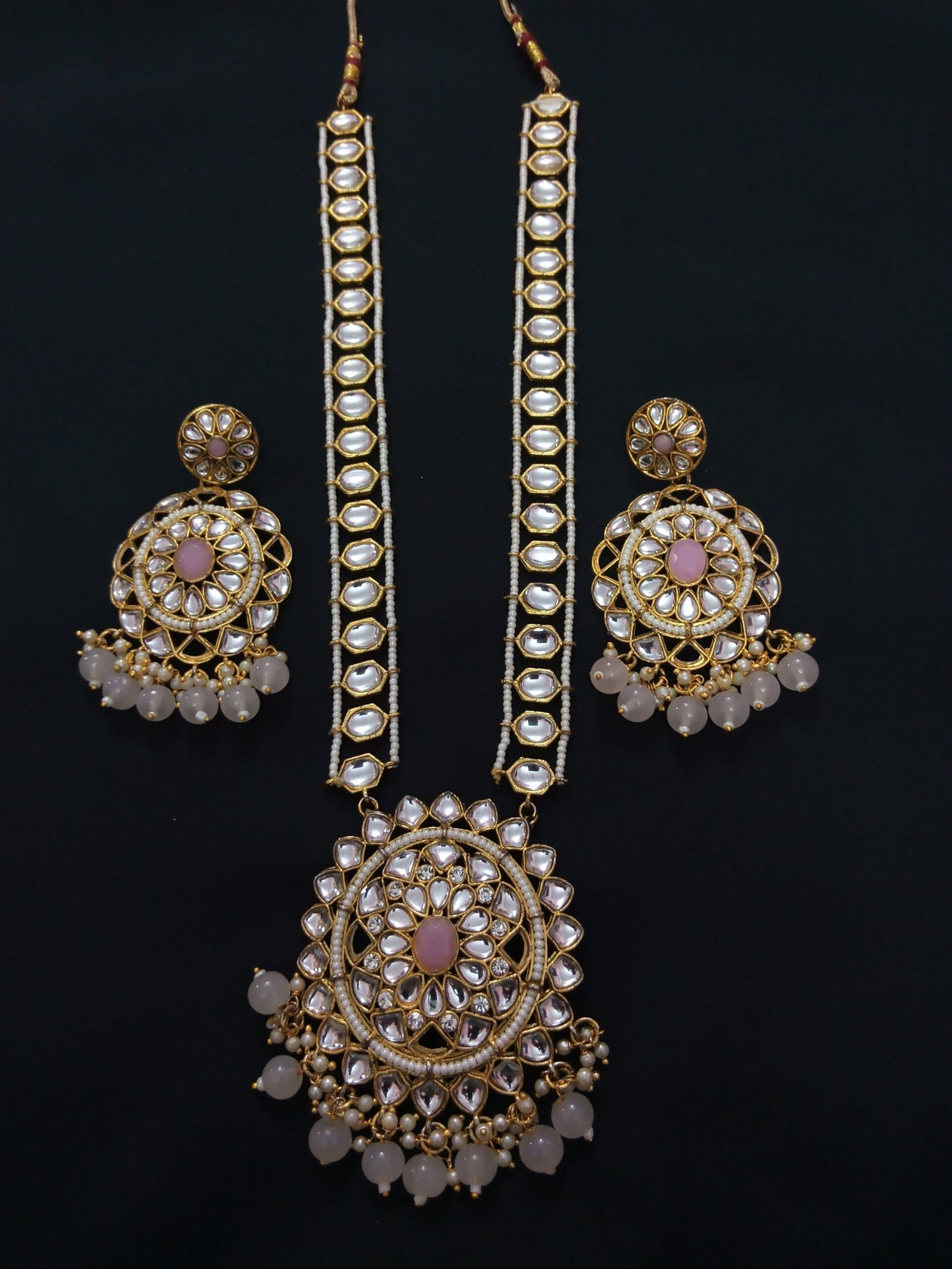 The Earrings mirror the pendant’s design, with a circular arrangement of Kundan stones around a central pink stone, and small bead drops at the bottom. The beads appear to be light pink, complementing the central stone.