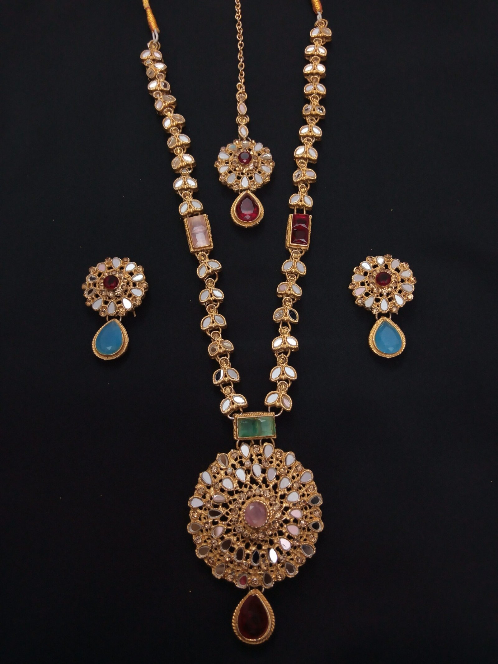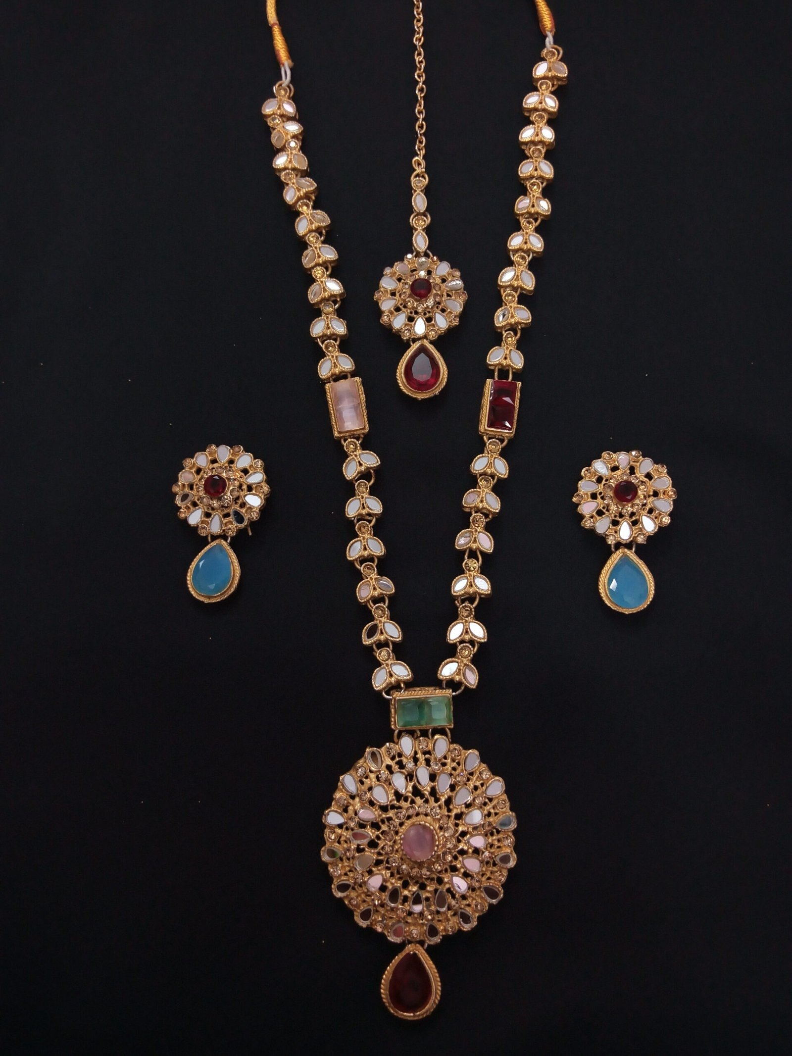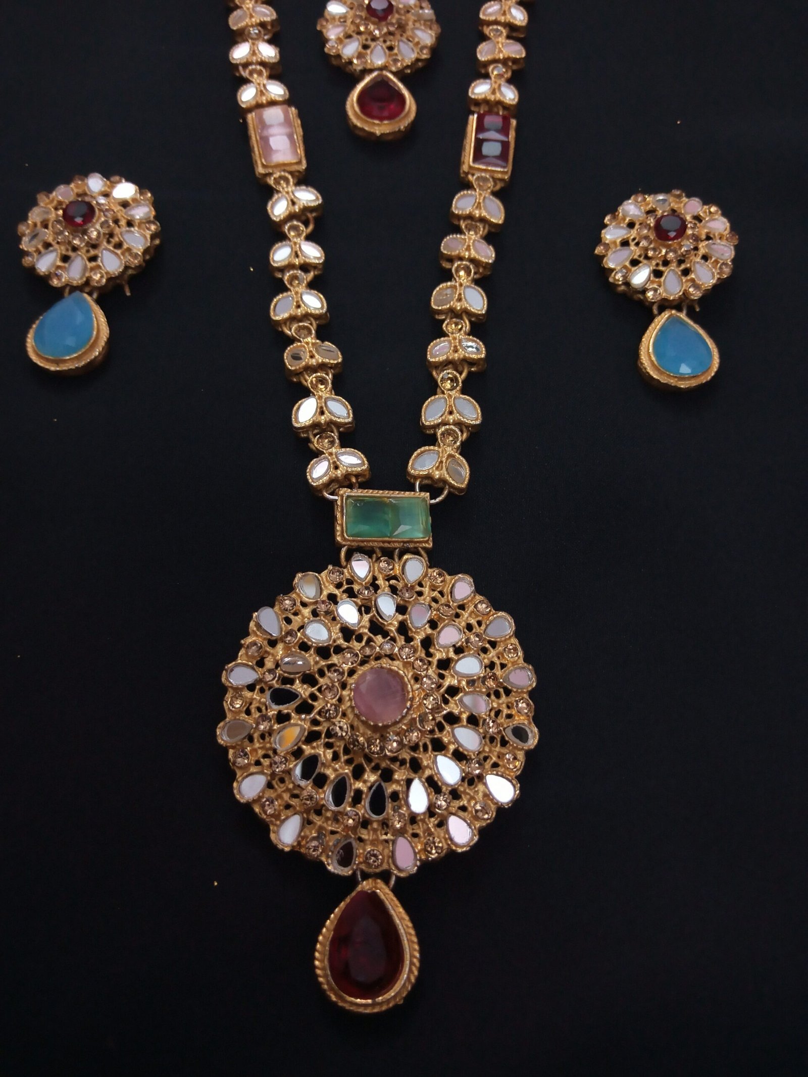 The jewellery set features intricate gold metalwork, adorned with embedded gemstones in vibrant hues of Red, Green, Blue, and Pink. The long chain features a symmetrical arrangement of gemstones, accented with mirror stones, culminating in a large circular pendant with a central gemstone and a teardrop-shaped red stone gracefully suspended at the bottom.