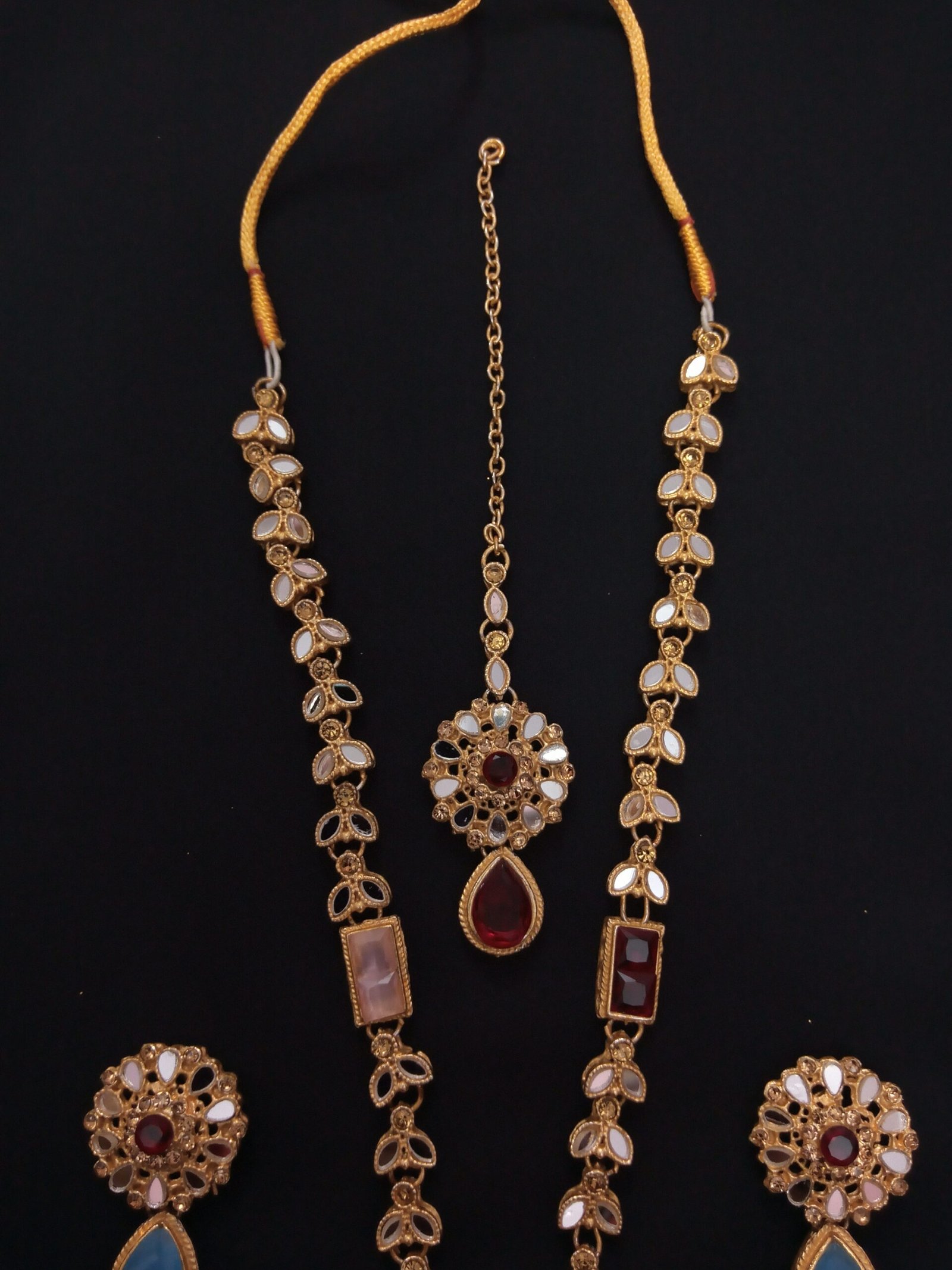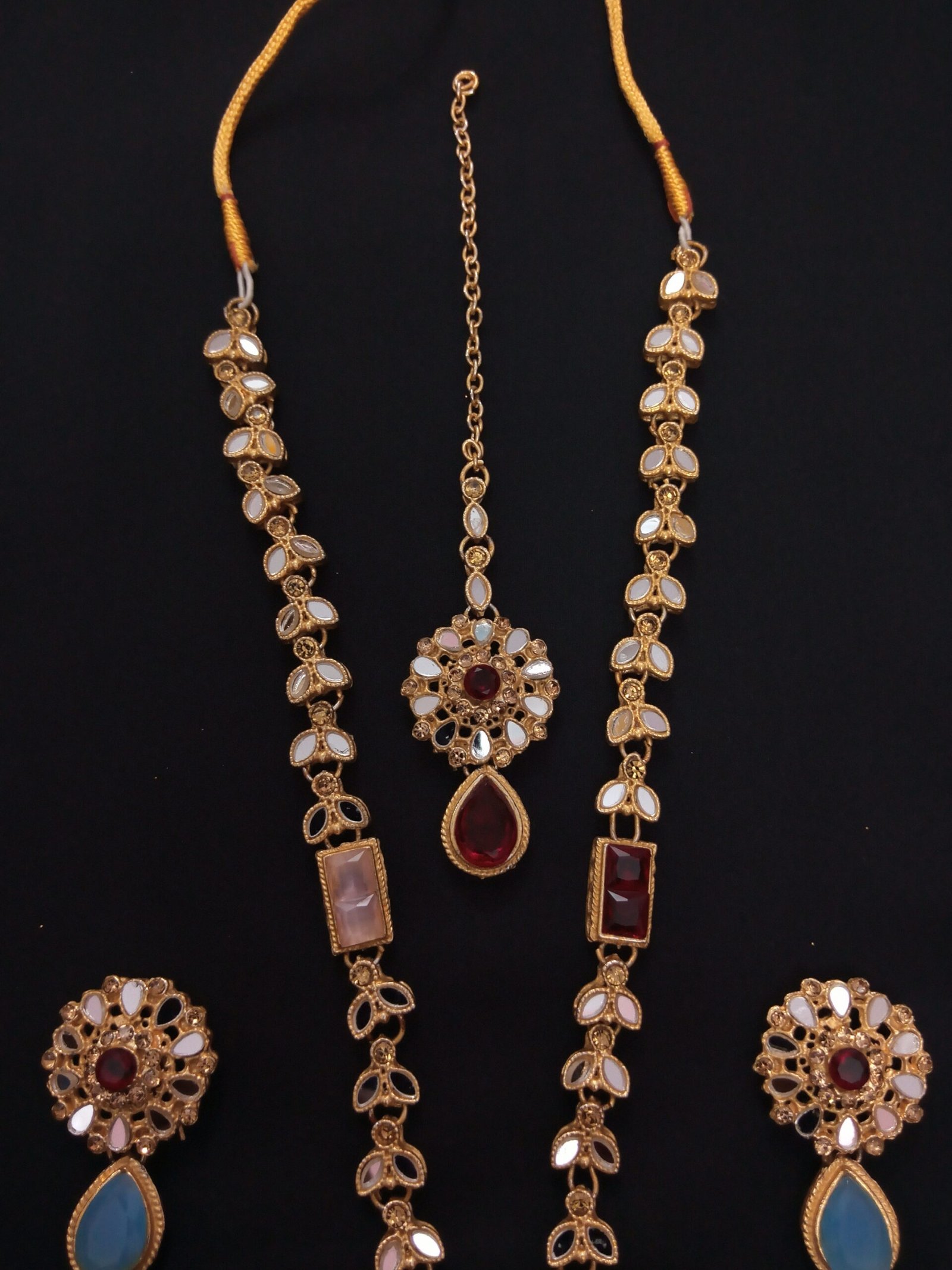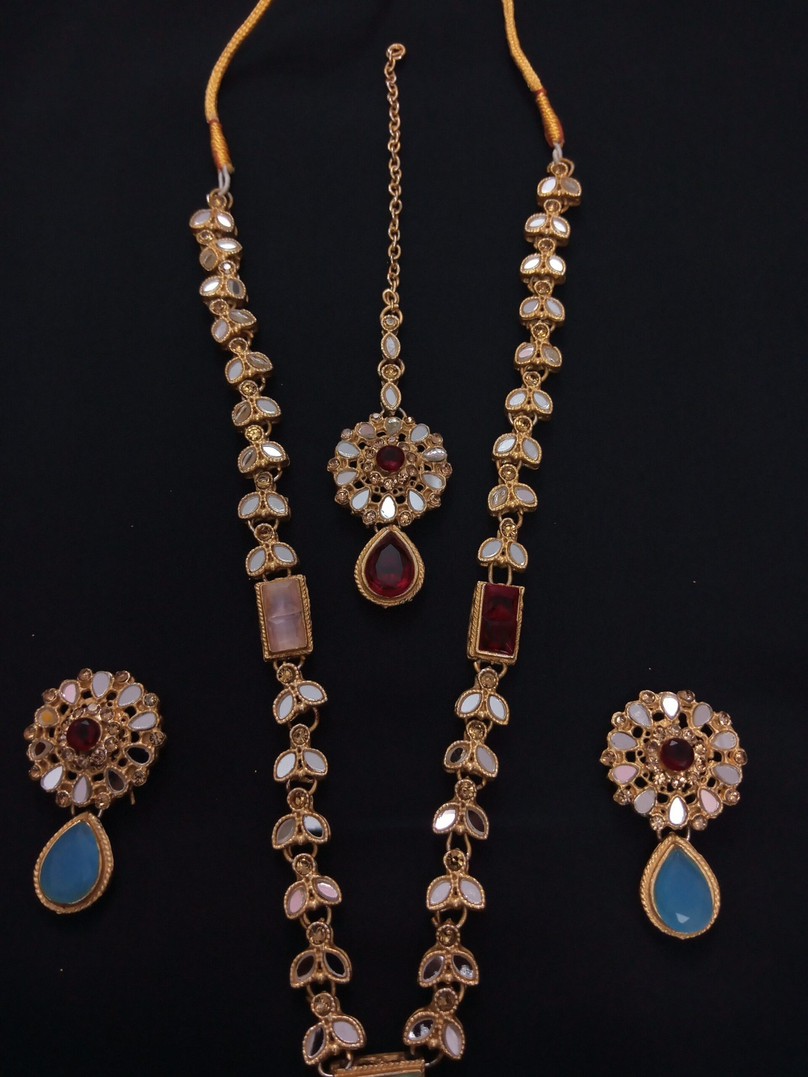 The matching earrings echo the pendant’s design, featuring circular tops with blue teardrop-shaped stones, while the mang tikka completes the ensemble with a red teardrop stone and an ornate, traditional design that exudes timeless elegance.