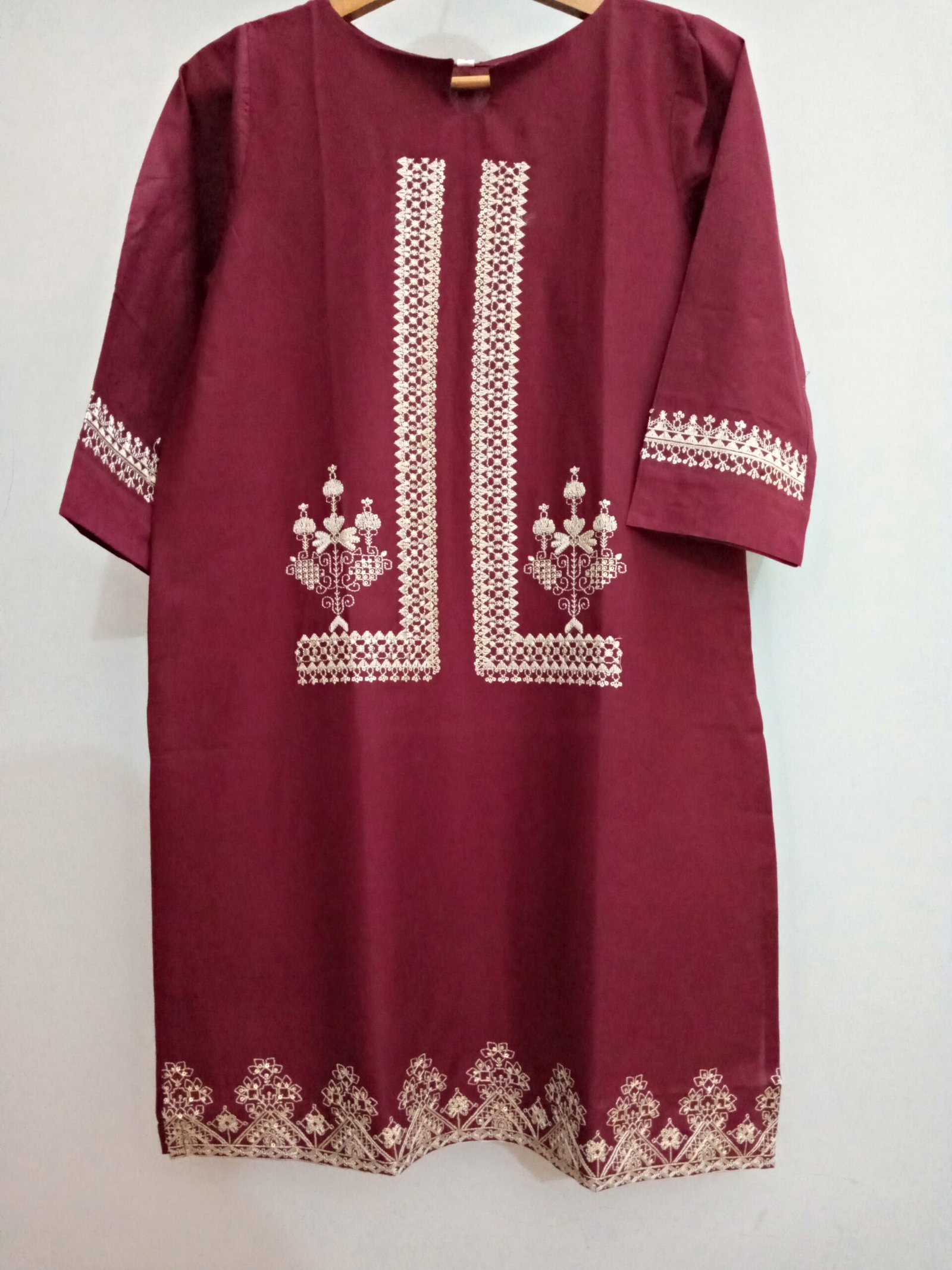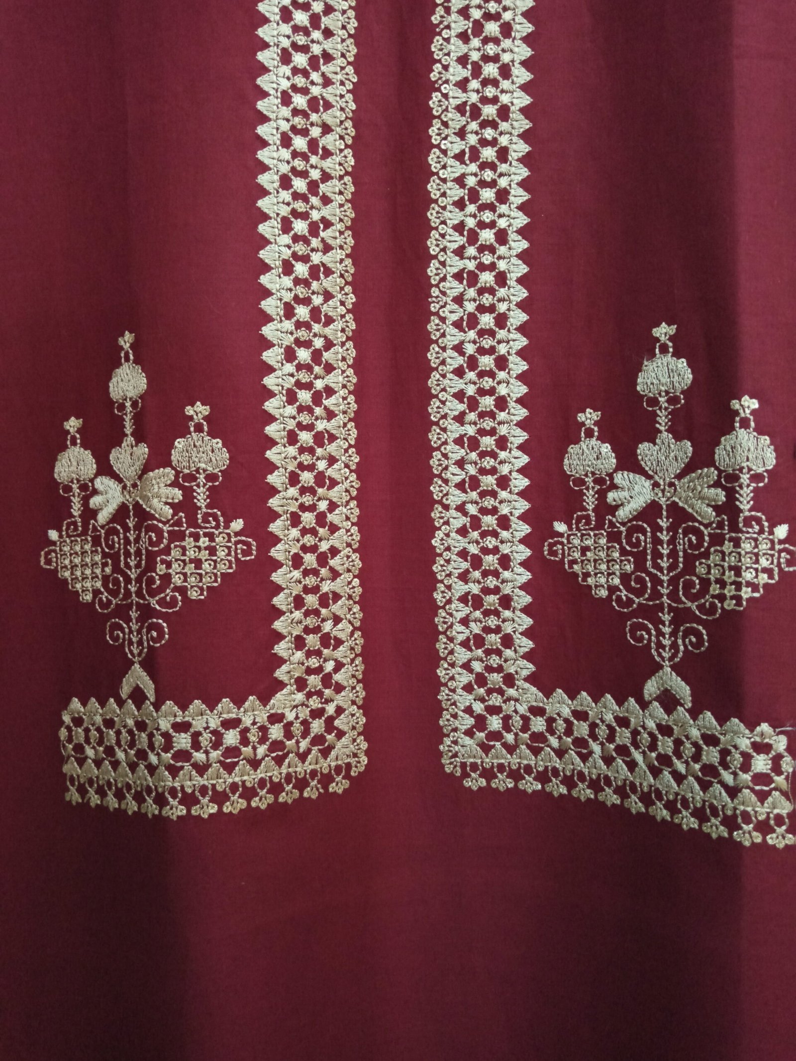 “Indulge in comfort and elegance with our soft Maroon light cambric Kurti, embellished delicately with shiny beige thread embroidery and glittry beige sequins, illuminating the front, sleeves, and front daman for a radiant summer ensemble, perfect for effortless elegance in the sun.”